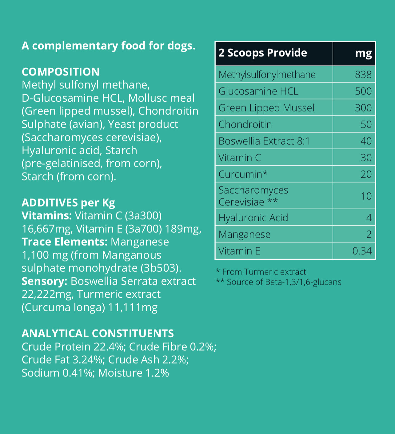 Regular use of KineticFlex promotes easier movement, faster recovery after activity, and long term joint comfort, helping your dog stay mobile, happy, and active throughout life.