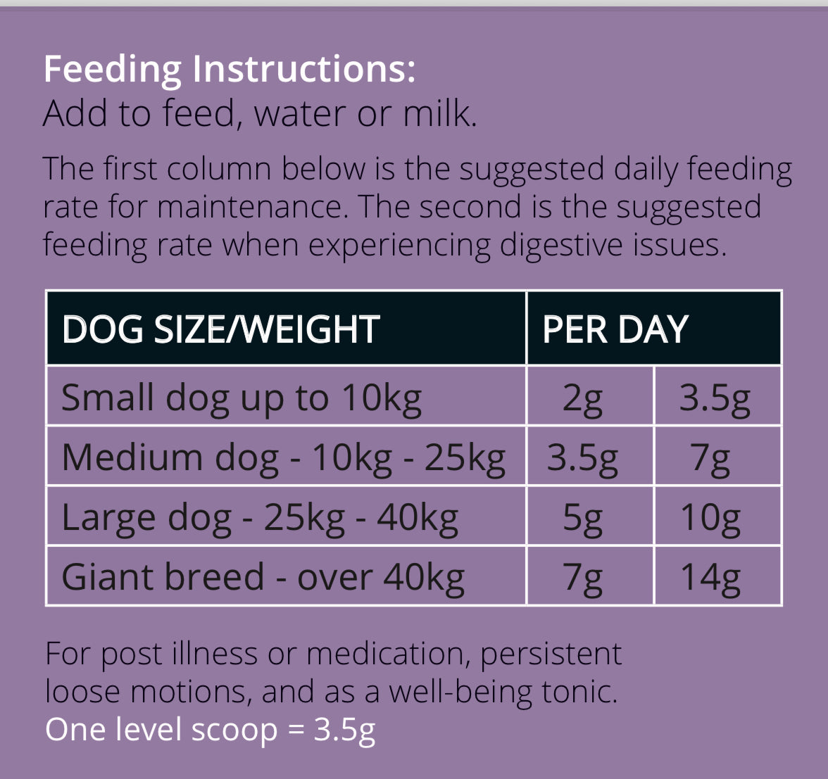 PreproFlex Advanced is supplied as an easy to mix powder. Add to your dog’s daily food once per day. Adjust feeding amounts according to your dog’s size and individual needs.